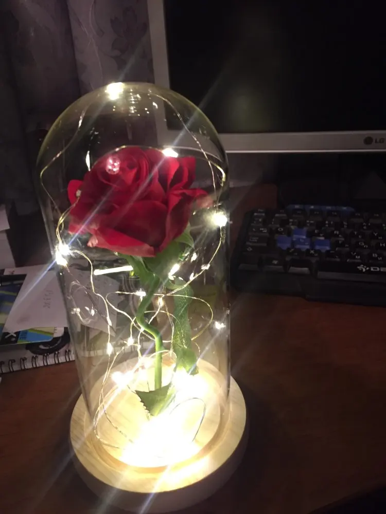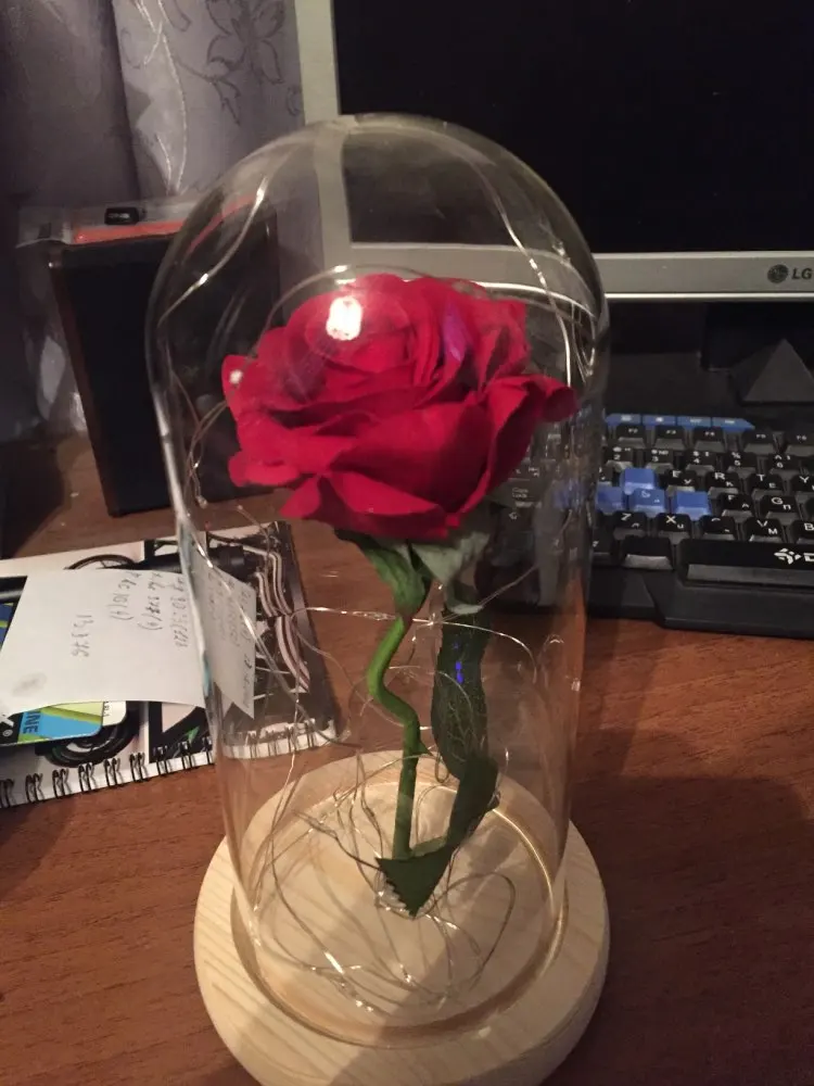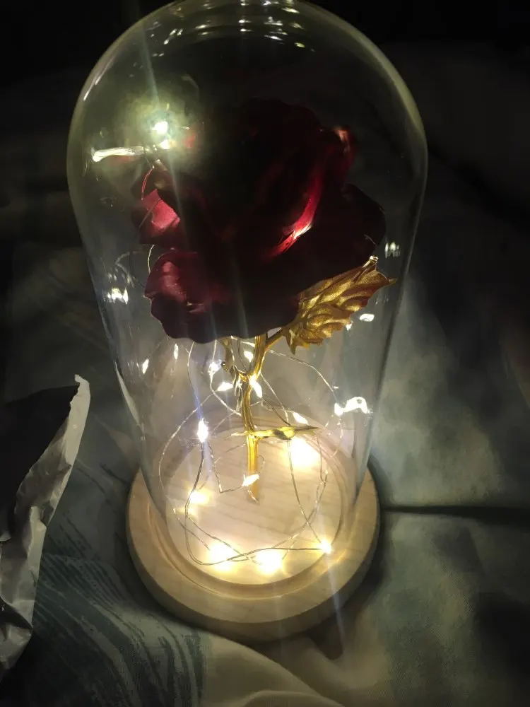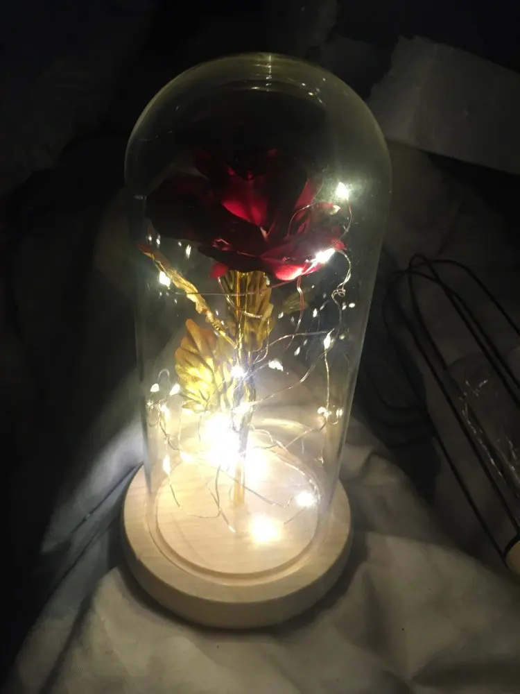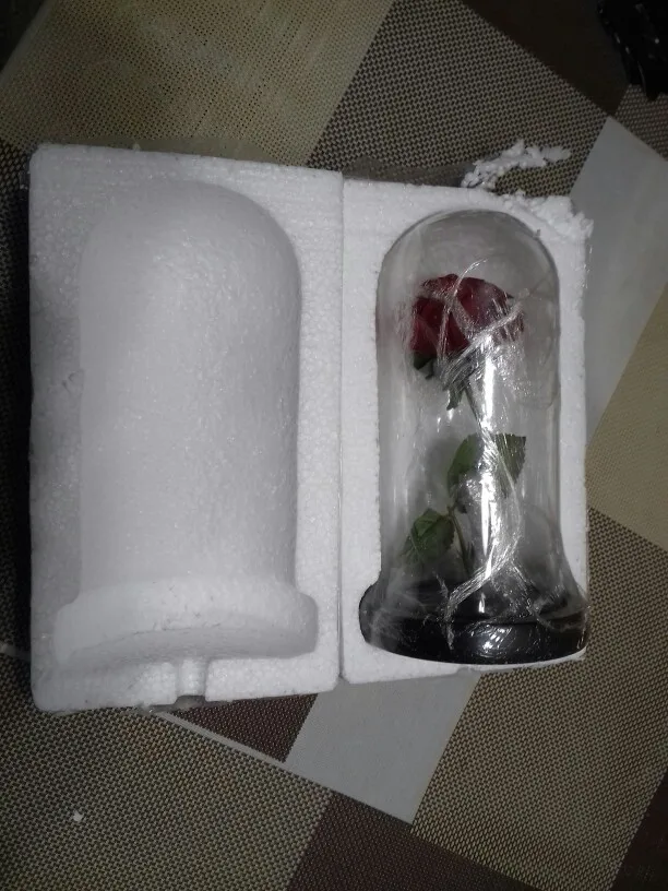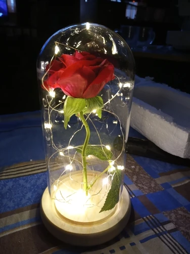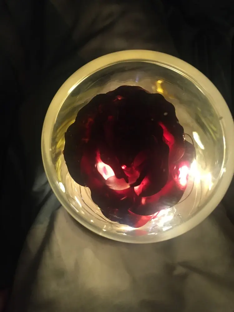 Beauty and The Beast Rose Kit size is 5.52" x H 9.65", Real Glass cover allows LED light to shine more brilliantly than a plastic cover, resists yellowing & discoloration, and is easier to clean. The tiny LED lights are embedded in the petals allowing the warm white light to illuminate the entire glass dome. Warm white light not only benefits our eyes but also provides a romantic atmosphere.